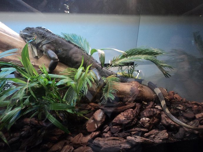 Una iguana enorme. En el terrario había un montón de grillos escondiendose para evitar convertirse en la cena del bicho.